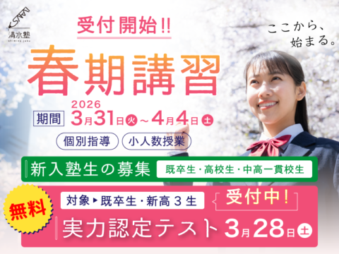 2026年3月20日 / 最終更新日 : 2026年3月20日 清水塾 季節情報 《お知らせ》2026年春期講習・新入生募集 こんにちは、教育プロジェクト清水塾です。 お待たせしました!2026年、春期講習の詳細をご案内いたします。 また、新高3生・既卒生には、3月28日(土)に実力認定テスト(無料)を実施することになりました。 日程等の詳細は […]