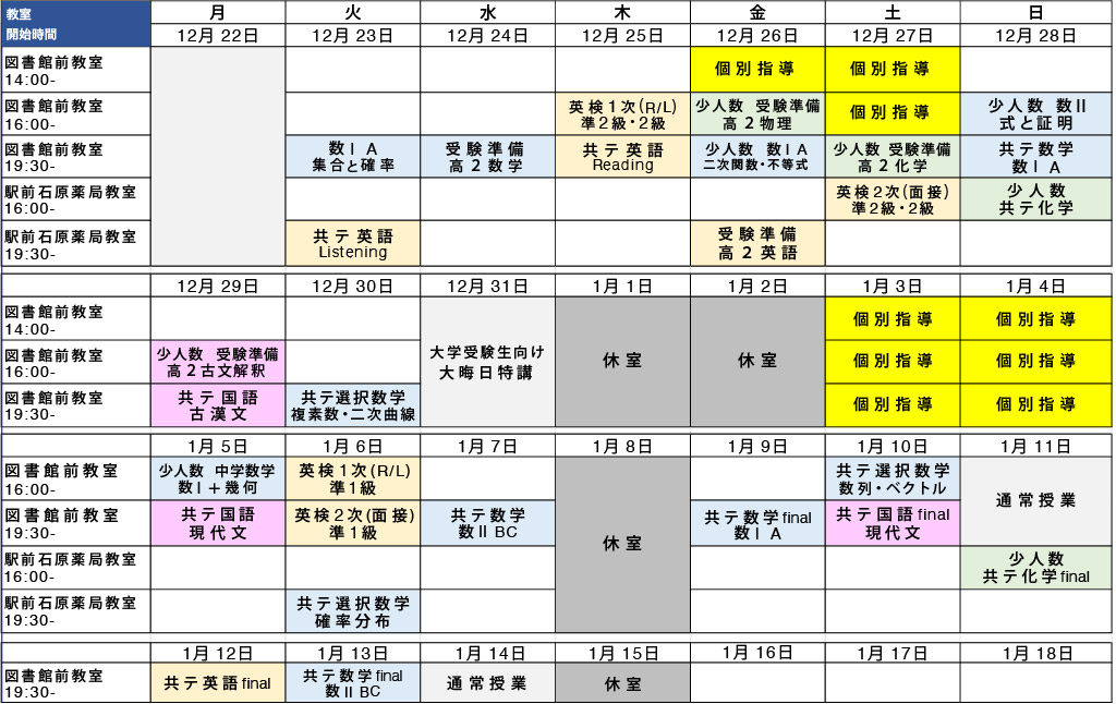 【冬期講習】スケジュール・講座内容紹介・料金